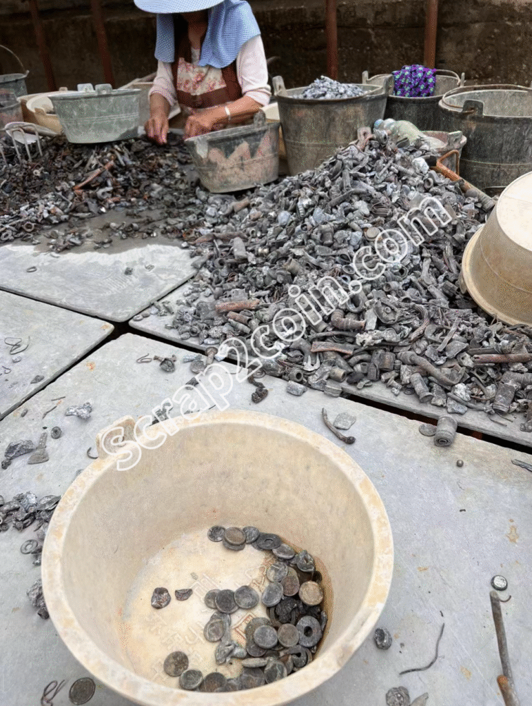 The images below explain how we obtain the coins and why they are damaged. As you can see from the pictures and descriptions, the coins are damaged because they are mixed with other scrap metals during the shredding process, and some have even been exposed to high-temperature incineration. Afterward, we clean the coins, as shown in the images below.